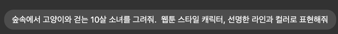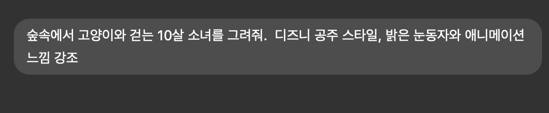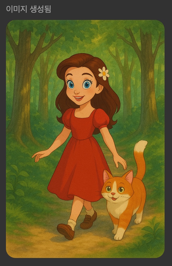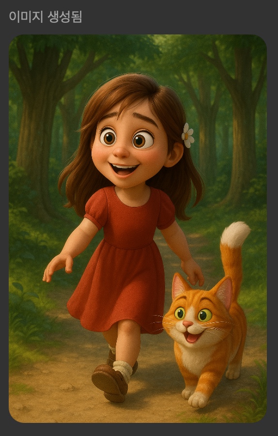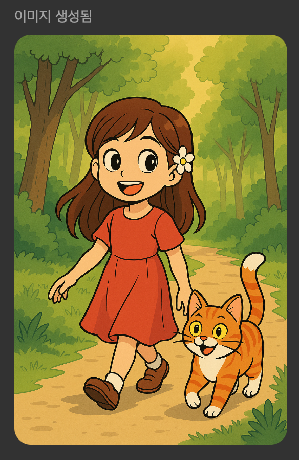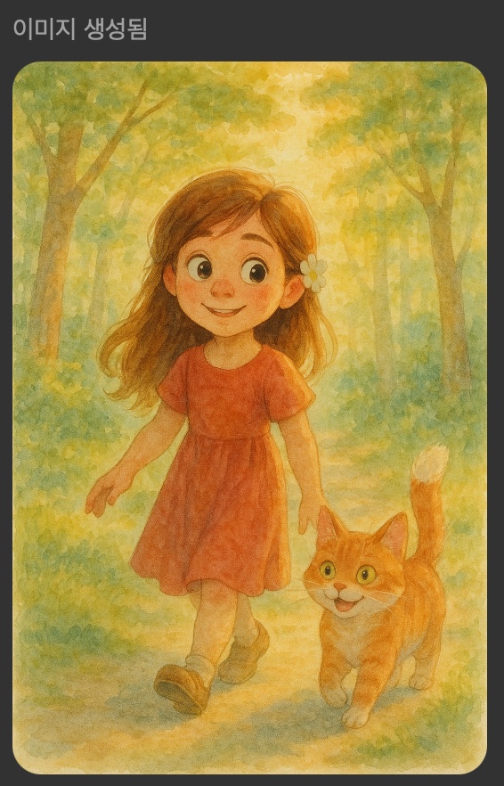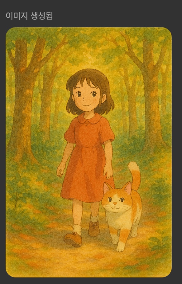 “지브리 애니 스타일로, 숲속에서 고양이와 걷는 10살 소녀를 그려줘. 따뜻한 색감, 수채화 느낌으로.” - 이미지 생성 후 저장하거나 활용!